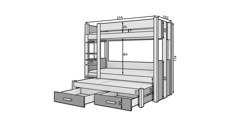 Az ARTEMA típusú háromszintes emeletes ágy kiváló megoldás helymegtakarításra kisebb gyermekszobákban. A bútor lépcsős létrával és két tágas, funkcionális Ágyneműtartó_fiókkal rendelkezik. A matracok nem részei az ágynak.