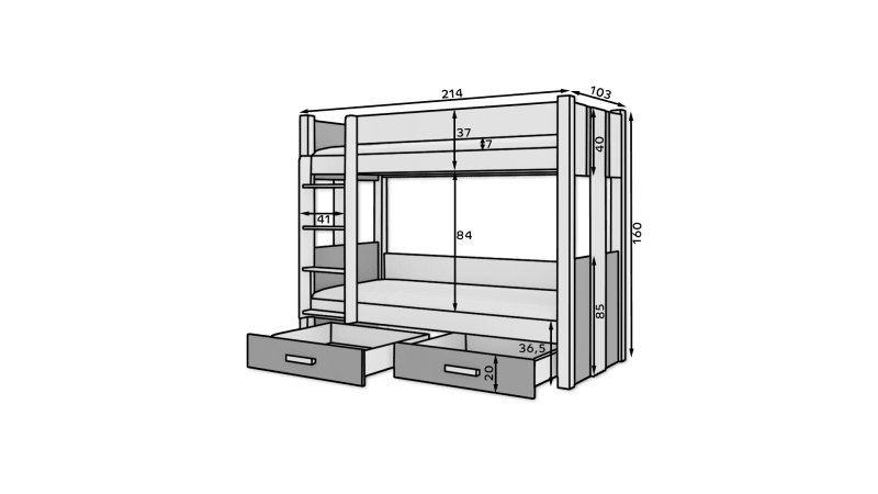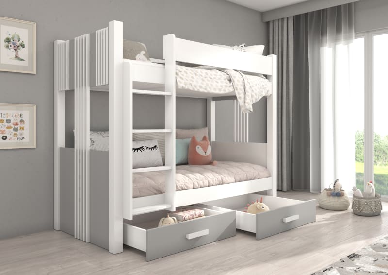 A kétágyas emeletes ágy ARTA tökéletes megoldás helymegtakarításra kisebb Gyermekszobákban. A bútor lépcsős létrával rendelkezik és két tágas, funkcionális fiókkal a ágyneműtároláshoz. A matracok nem tartoznak az ágyhoz.