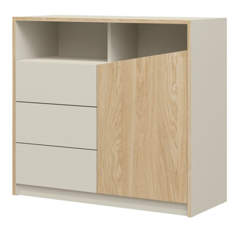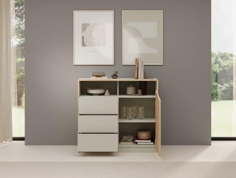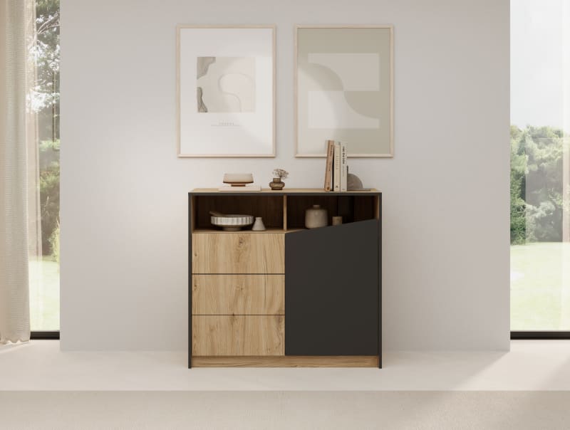 Az Atson I komód tölgy színben tökéletesen illeszkedik minden belsőépítészeti elrendezésbe – klasszikus, skandináv, modern egyaránt. Ez egy kiváló választás azok számára, akik szeretnék ötvözni a praktikumot az esztétikummal, és harmonikus és funkcionalizált teret kialakítani otthonukban.
