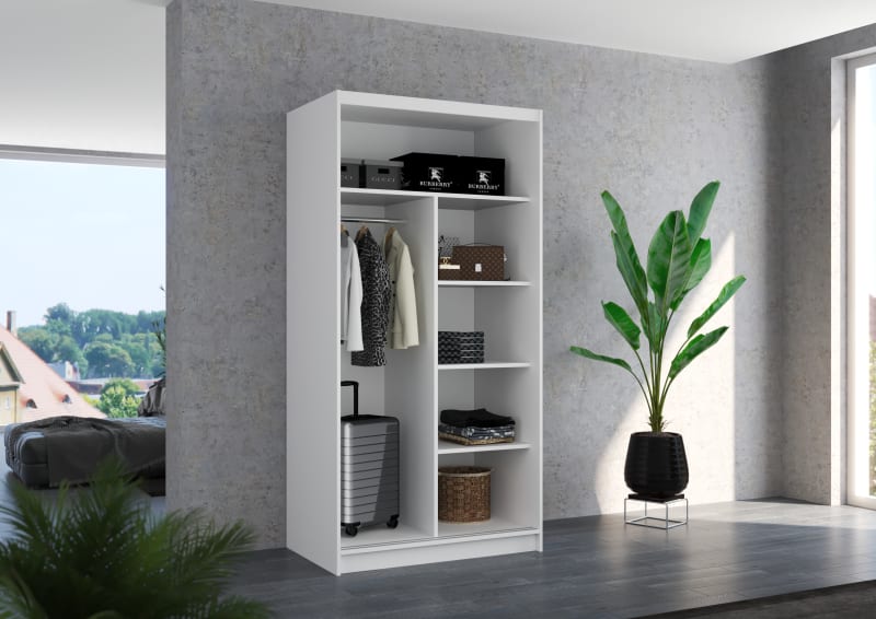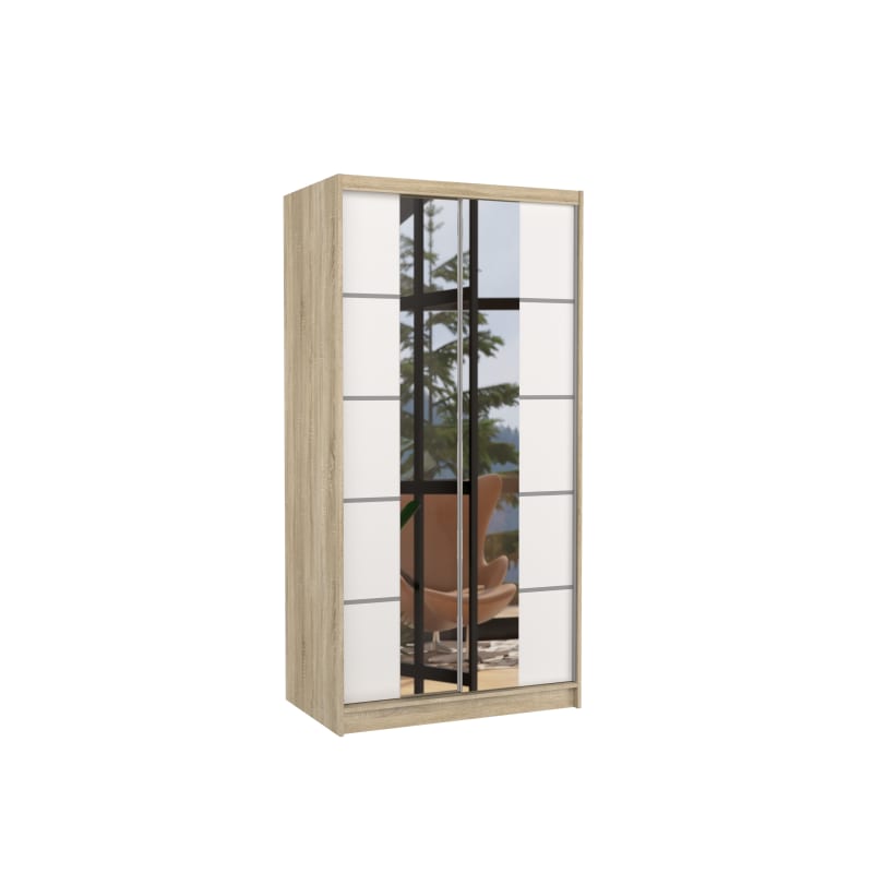 A KSAWER tolóajtós szekrény tökéletes megoldás a tér rendezésére. A bútor tágas polcokkal és ruha akasztóval van felszerelve, ahol fel tudod akasztani a ruhákat, öltönyöket, külső ruházatot vagy ingeket. Az előlapján található tükör és az ezüstszínű díszes vízszintes csíkok egyedi stílust kölcsönöznek a bútornak. A tolóajtós kialakításnak köszönhetően nem szükséges külön helyet szánni az ajtónyitásra, így tökéletes megoldás kis szobák vagy keskeny előszobák számára.
