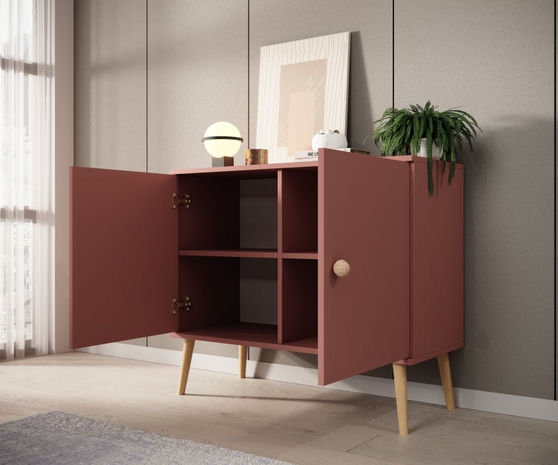 Ez a stílusos Deri komód tökéletes választás a modern belső terekhez. Minimalista dizájnja, magas fa lábai és kötél formájú fogantyúi egyedi karaktert kölcsönöznek neki. Az ajtók halk záródású mechanizmussal és állítható polcokkal rendelkeznek, így a teret saját igényei szerint alakíthatja. A tartós, 18 mm vastag anyagok biztosítják a hosszú élettartamot és tartósságot. Hozza létre a harmóniát otthonában, és kombinálja ezt a komódot más bútorokkal!