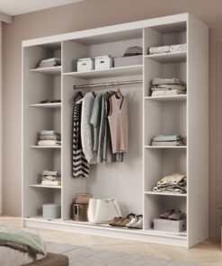 A Greta 200 tolóajtós szekrény egy modern és funkcionális megoldás, amely kiválóan megállja a helyét bármely hálószobában, gardróbban vagy előszobában. Minimalista formája, geometrikus osztású előlapjai és gondos kidolgozása elegáns és időtlen jelleget kölcsönöznek a belső térnek. A bútordarab kiváló minőségű, 16 mm vastag laminált lapból készült, amely karcálló, nedvességgel és UV-sugárzással szemben ellenálló – így hosszú éveken át biztosítja a tartósságot és az esztétikus megjelenést. A szekrény tolóajtós rendszerrel van felszerelve, amely kényelmes nyitást és zárást tesz lehetővé, miközben helyet takarít meg – ideális választás kisebb helyiségekbe is. A szekrény belső tere maximális funkcionalitás jegyében lett kialakítva – polcok és akasztórudak segítik a ruhák, kiegészítők és más mindennapi használati tárgyak rendszerezését. A Greta 200 modell öt színváltozatban érhető el: klasszikus fehér, elegáns fekete, modern fehér + fekete kombináció, fekete + fehér és trendi kasmír árnyalatban.