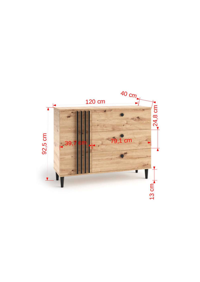 A LIVIA gyűjtemény komódja olyan bútor, amelyet nappaliba, hálószobába vagy irodába terveztek. A természetes fa hatását hangsúlyozzák a fekete kiegészítők és betétek. A modern stílusban megvalósított kialakítás biztosan felhívja magára a figyelmet. Egyszerű, mégis funkcionális. Arra ösztönözzük Önt, hogy megismerje a LIVIA gyűjtemény többi termékét is