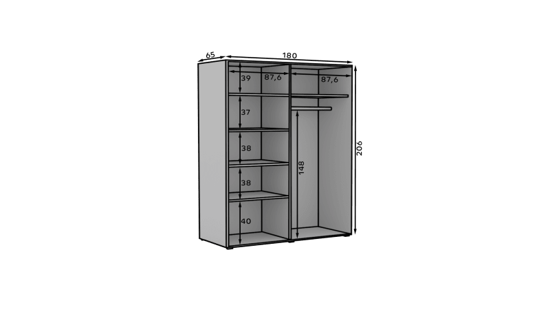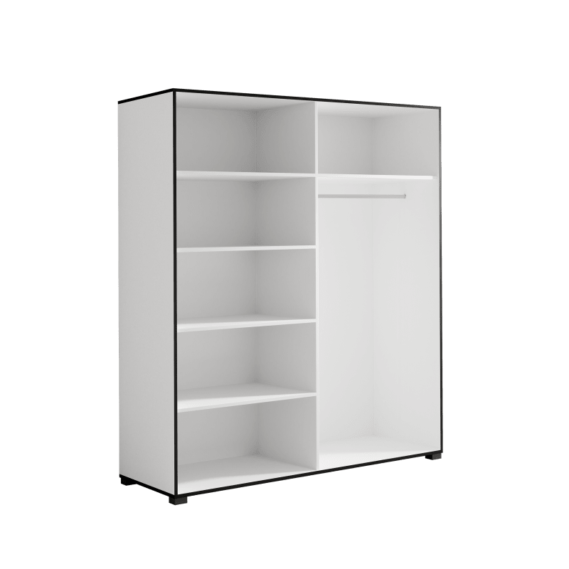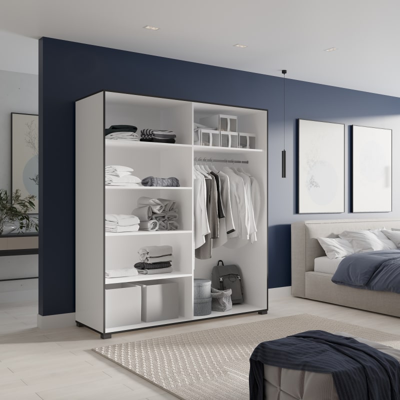 Az OSMA nyíló ajtós szekrény kiváló választás a nappaliba, hálószobába vagy előszobába. Kényelmes tárolóhelyet biztosít. Akasztósínnel és tágas polcokkal felszerelve könnyedén rendszerezheti szobáját. Egyszerű, mégis funkcionális. Arra biztatjuk, hogy tekintse meg az OSMA gardróbszekrény három elérhető méretét.