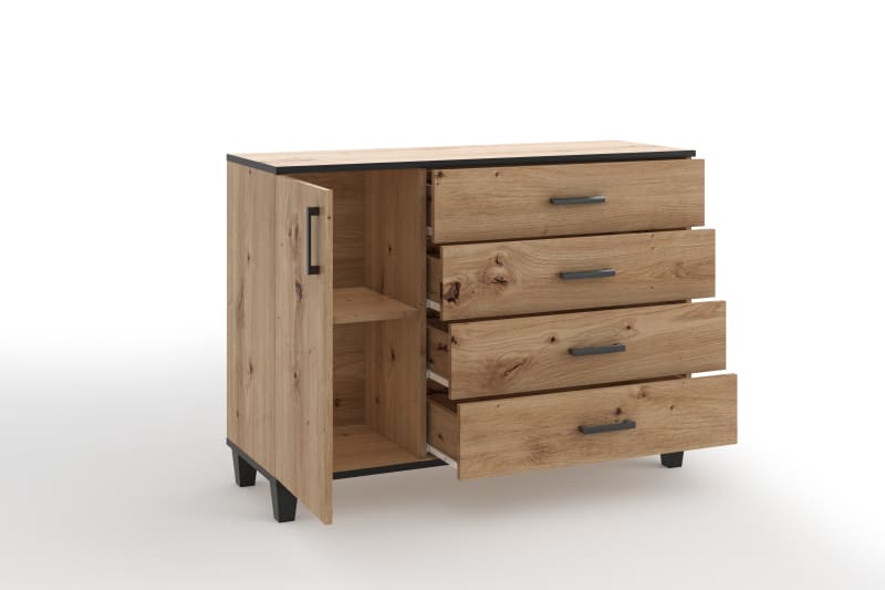 A POLA gyűjtemény komódja olyan bútor, amelyet nappaliba, hálószobába vagy irodába terveztek. A természetes fa hatását hangsúlyozzák a fekete kiegészítők és betétek. A modern stílusban megvalósított kialakítás biztosan felhívja magára a figyelmet. Egyszerű, mégis funkcionális. Arra ösztönözzük Önt, hogy megismerje a POLA gyűjtemény többi termékét is.
