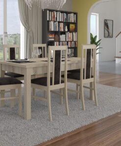 A Rhodes 52 szett ideális megoldás egy klasszikus étkezőhöz. A szett tartalmaz egy masszív asztalt és hat kényelmes széket. Az egyszerű formájú asztal kényelmesen befogadhat hat embert. A bútorok nagyon elegánsak és kényelmesek. Válassza ki álmai szettjének színét és textil kollekcióját.