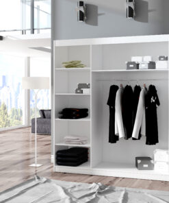 Az ANTOS tolóajtós szekrény ideális módja a tér rendszerezésének. A bútor tágas polcokkal és ruhásszárítóval van felszerelve, ahol ruhákat, öltönyöket, külső ruhákat vagy ingeket lehet akasztani. A tolóajtós kivitelének köszönhetően nem szükséges plusz helyet biztosítani az ajtó kinyitásához, így tökéletes megoldás kis hálószobákhoz vagy keskeny előszobákhoz. Érdekes előnye az esztétikus LED világítás, amely varázslatos bájt kölcsönöz mind a szekrénynek, mind a helyiségnek.
