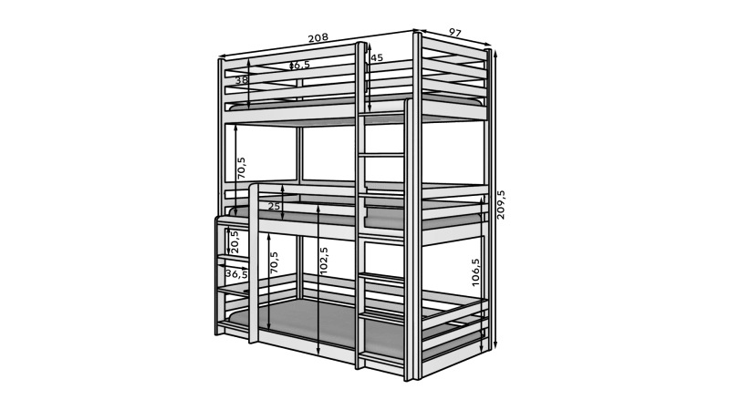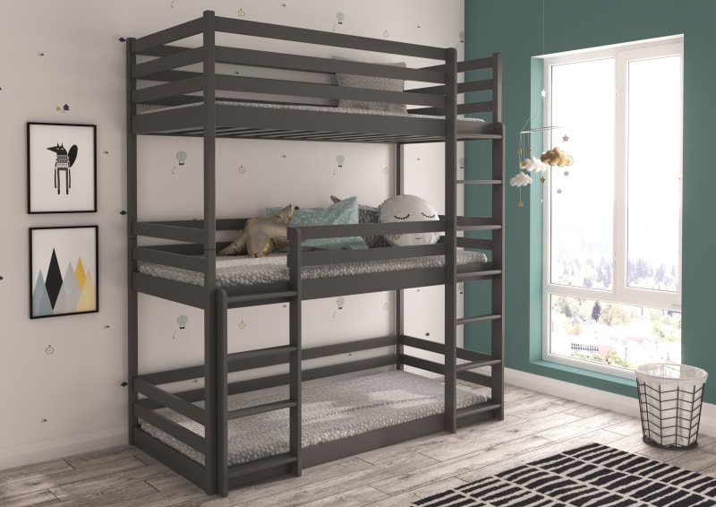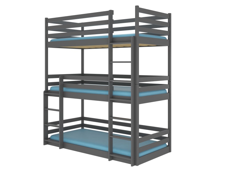 A TEDRO három személyes emeletes ágy kiváló ötlet helymegtakarításra egy kis Gyermekszobában. Minden emelet egymás felett helyezkedik el. A bútor két stabil lépcsős létrával és szinte minden oldalon elhelyezett védőkorlátokkal rendelkezik, így biztos lehet benne, hogy gyermeked teljesen biztonságban van alvás közben. Matracok nem tartoznak az ágyhoz.