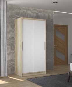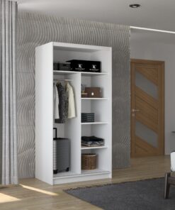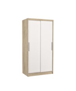 Az ASTEN tolóajtós szekrény tökéletes megoldás a tér rendezésére. A bútor tágas polcokkal és ruhásszárítóval van felszerelve, ahol fel tudod akasztani ruháidat, öltönyeidet, külső ruházatodat vagy ingeidet. A tolóajtós kialakításnak köszönhetően nem szükséges külön helyet szánni az ajtónyitásra, így ideális megoldás kis szobák vagy keskeny előszobák számára.