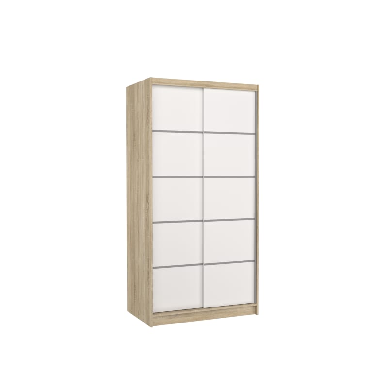 A RIVA tolóajtós szekrény ideális megoldás a tér rendezésére. A bútor tágas polcokkal és ruha akasztóval van felszerelve, ahol fel tudod akasztani ruháidat, öltönyeidet, külső ruházatodat vagy ingeidet. Az előlapján elhelyezett ezüstszínű díszes vízszintes csíkok egyedi stílust kölcsönöznek a bútornak. A tolóajtós kialakításnak köszönhetően nem szükséges külön helyet szánni az ajtónyitásra, így tökéletes megoldás kis szobák vagy keskeny előszobák számára.