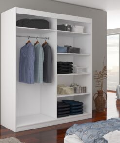 A BALANCE tolóajtós tükrös szekrény ideális módja a tér rendszerezésének. A bútor tágas polcokkal és ruhásszárítóval van felszerelve, ahol ruhákat, öltönyöket, külső ruhákat vagy ingeket lehet akasztani. Az elején tükröt rögzítettek, amely optikailag nagyítja a teret. A tolóajtós kialakításnak köszönhetően nem szükséges extra helyet biztosítani az ajtók kinyitásához, így tökéletes megoldás kis hálószobákhoz vagy keskeny előszobákhoz. Érdekes előnye az esztétikus LED világítás, amely varázslatos bájt kölcsönöz mind a helyiségnek, mind a szekrénynek.