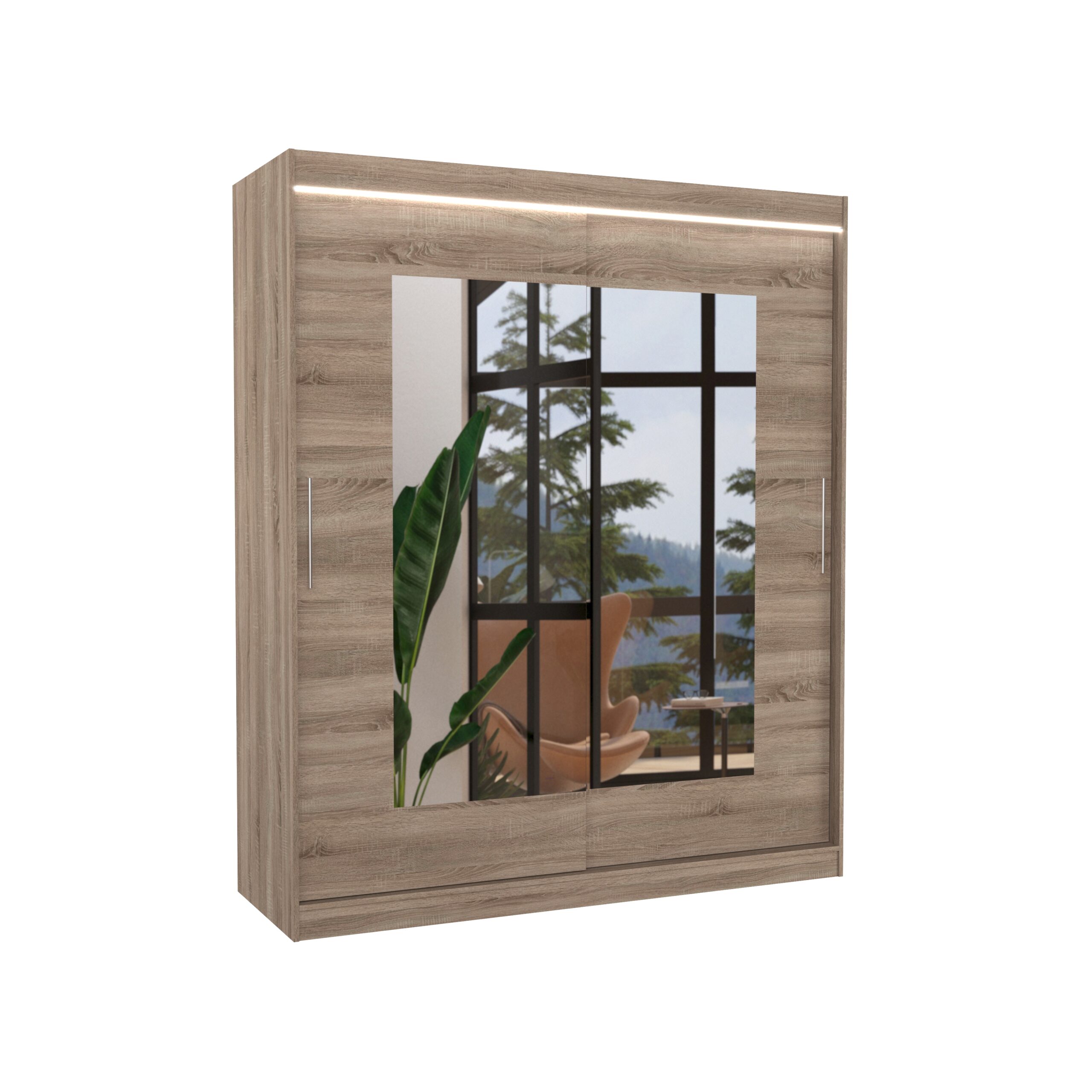 A ROSETTE tolóajtós tükrös szekrény ideális módja a térrendezésnek. A bútor tágas polcokkal és ruhásszárítóval van felszerelve, ahol ruhákat, öltönyöket, külső ruhákat vagy ingeket lehet akasztani. Az elején tükröket rögzítettek, amelyek optikailag nagyítják a teret. A tolóajtós kialakításnak köszönhetően nem szükséges plusz helyet biztosítani az ajtók kinyitásához, így tökéletes megoldás kis hálószobákhoz vagy keskeny előszobákhoz. Érdekes előnye az esztétikus LED világítás, amely varázslatos bájt kölcsönöz mind a szekrénynek, mind a helyiségnek.