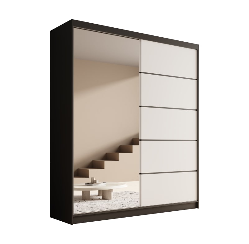 A Nico 180 tolószekrény tükörrel elegáns és funkcionális megoldás a modern belső terekbe. Kiváló minőségű, 16 mm vastag laminált lapból készült, így biztosítja a tartósságot és a sérülésekkel szembeni ellenállást. Tágas kialakítású, 180_cm széles, így ideális ruhák és egyéb kiegészítők tárolására. Tükörrel felszerelt tolóajtói optikailag megnövelik a teret, könnyedséget és stílust kölcsönözve a belső térnek. Egyszerű, mégis elegáns kialakításának köszönhetően a szekrény tökéletesen illeszkedik a különböző elrendezésekbe – a klasszikustól a modernig. Funkcionalitás, esztétikum és helytakarékosság teszi kiváló választássá bármely lakásba.