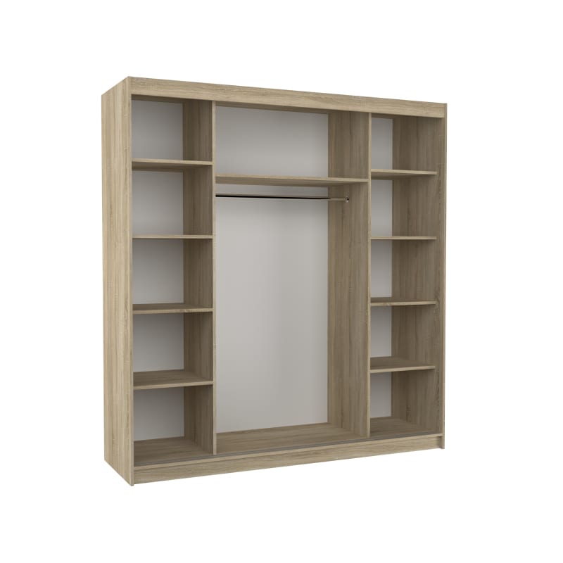 Az OLIVER tolóajtós gardróbszekrény ideális megoldás a térrendezéshez. A bútor tágas polcokkal és ruhásszekrénnyel van felszerelve, ahol ruhákat, öltönyöket, külső ruházatot vagy ingeket lehet felakasztani. Az előlapon tükröt és jellegzetes ezüstszínű vízszintes csíkokat találsz, amik egyedi stílust kölcsönöznek a bútornak. A tolóajtós kialakításának köszönhetően nem kell külön helyet szentelni a nyitáshoz, ezért tökéletes választás kis szobákba vagy keskeny előszobákba is.