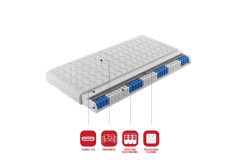 A MONTI Zsákrugós matrac jellemzője a magas rugalmasság és a test pontonkénti támasztása alvás közben, így enyhíti a gerinc terhelését és biztosítja a jobb pihenést. A matrac töltése magas minőségű T25 típusú poliuretán habból készült, amely közepesen kemény (H3 Matrac_Keménységi fokozat). A MONTI modell antiallergén, steppelt huzattal rendelkezik, amely nem vonzza a port, atkákat és más allergéneket, így nagy népszerűségnek örvend az allergiás reakciókra hajlamos és bőrirritációra érzékeny emberek körében. Emellett 40 fokos vízben mosható, ami még inkább megkönnyíti az alvás higiéniájának fenntartását. A huzat cipzárral ellátott, így könnyen le- és felhúzható.